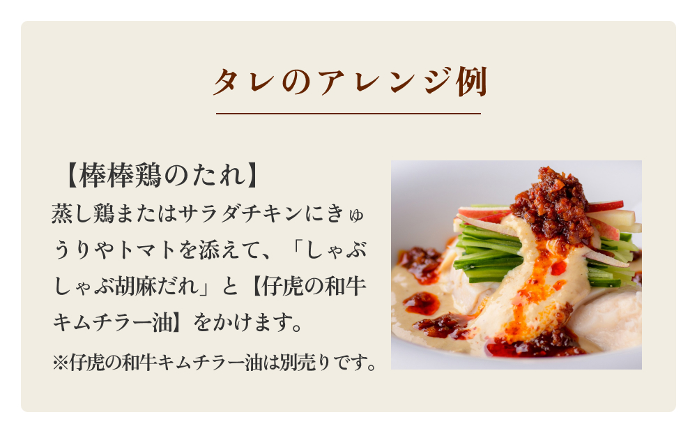 作り方:蒸し鶏またはサラダチキンにきゅうりやトマトを添 えて、「しゃぶしゃぶ胡麻だれ」と【仔虎の和牛キムチラー油】をかけます。