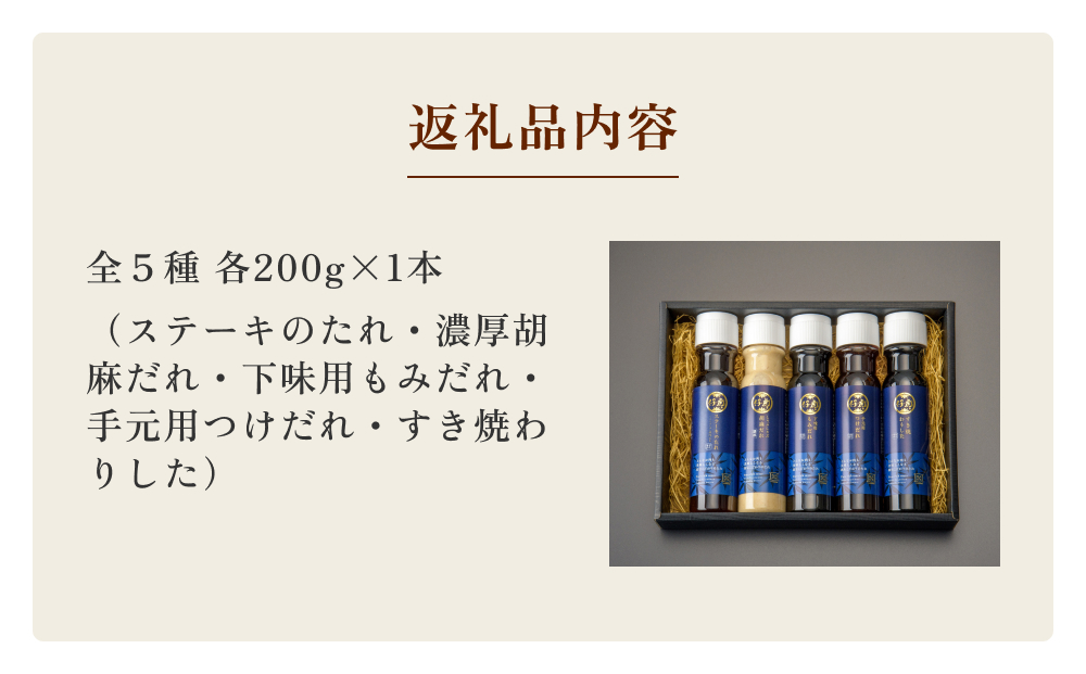 ステーキのたれ/濃厚胡麻だれ/下味用もみだれ/手元用つけだれ/すき焼わりした 各200g