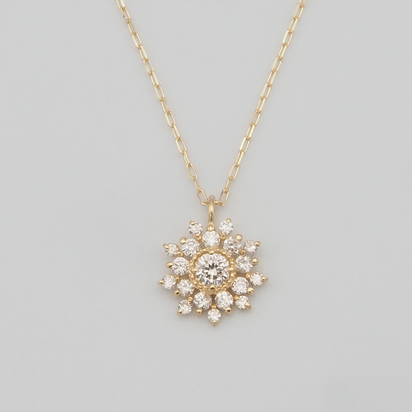 キュートなフォルムで胸元で輝き、カジュアルに着けれるアイテム。