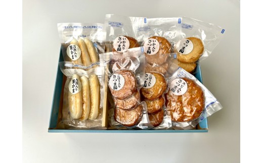 笹かまぼこ3枚×2P、揚げかまぼこ3枚×1P、いか入り揚げかまぼこ×2P、ごぼう入り揚げかまぼこ×2P、エビ入りさつま揚げ1P