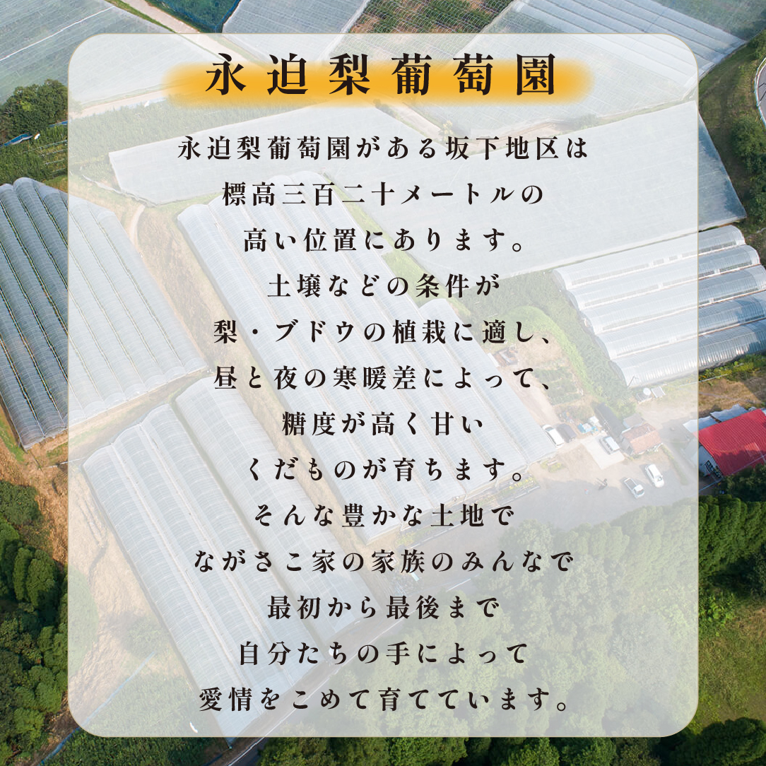 地元で大人気の観光農園・永迫梨葡萄園は、標高320mの高所にあり、土壌などの条件が梨・ぶどうの植栽に適し、昼と夜の寒暖差によって、糖度が高く甘いくだものが育ちます。