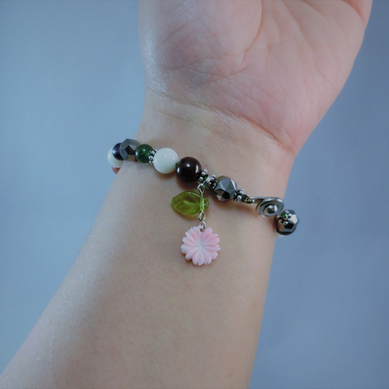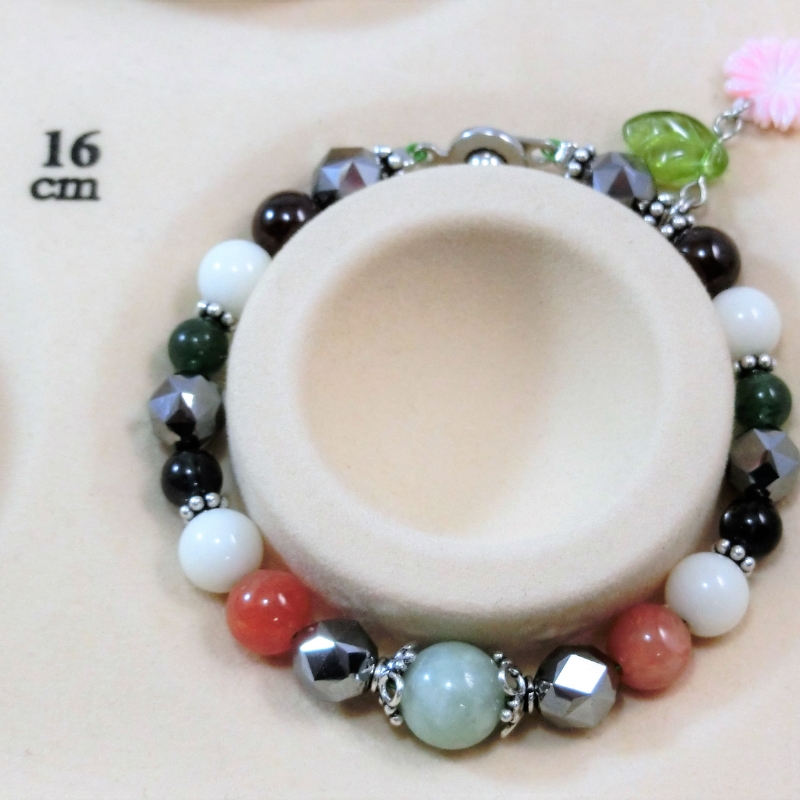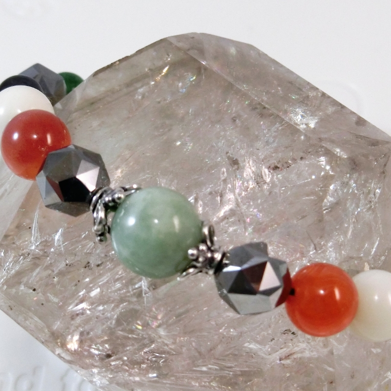 〈使用している石、部材〉 本翡翠、白珊瑚、アベンチェリン、ガーネット、アイオライト、オレンジカルサイト、テラヘルツ鉱石 留め金の部分と繋いでいるワイヤーは合金です。