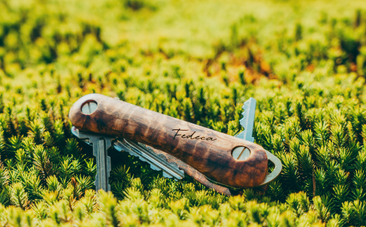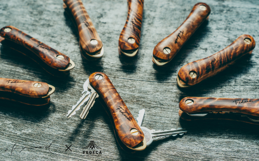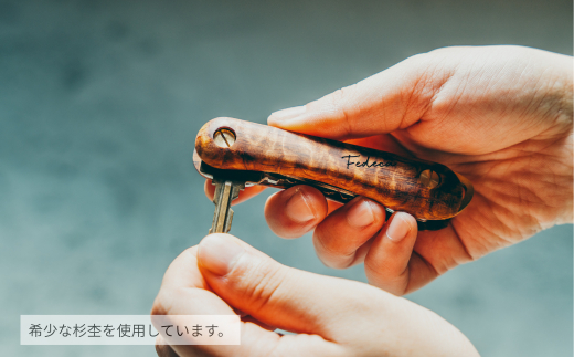 今回、そのキーオーガナイザーの柄をスカイウッドが奥吉野の特殊な杉の原木から製材、乾燥、木取りをし、最終加工の特殊前処理をしたものを、フェデカが美しい唯一無二のオリジナルキーオーガナイザーに仕上げました。