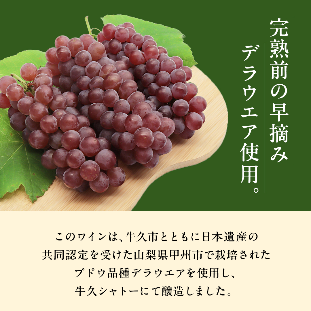 このワインは、牛久市とともに日本遺産の共同認定を受けた山梨県甲州市で栽培されたブドウ品種「デラウエア」を使用し、