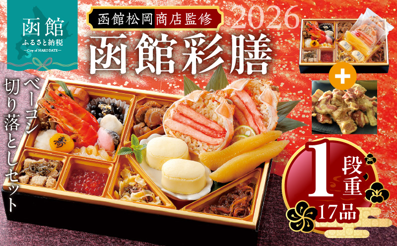 函館ならではのおせち「函館彩膳 1段重(17品)」と「函館カール・レイモンベーコン切り落とし」のセットです。