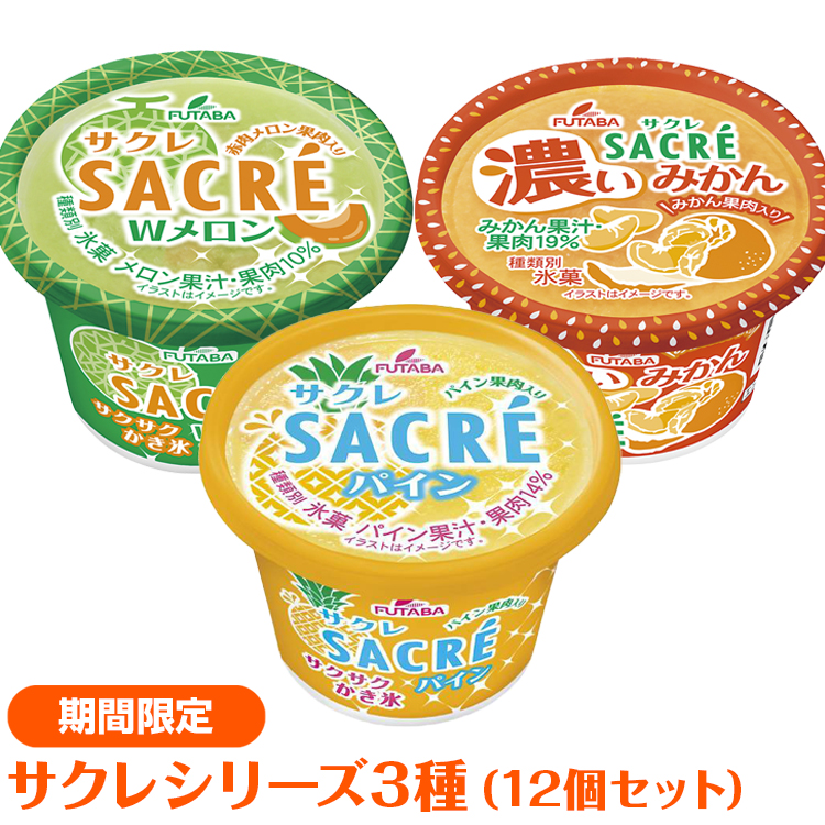 ゴロゴロ入った果肉のジューシー感とパインの甘い香りをお楽しみいただける「サクレパイン」、爽やかな青肉メロン味のみぞれに赤肉メロンをたっぷり混ぜ込んだ「サクレWメロン」、氷粒を小さくし、くちどけの良いマイルドなひんやり感をお楽しみいただけるサクレの濃いシリーズ「サクレ濃いみかん」3種をお届けします!