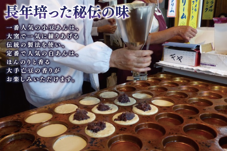 長年培った秘伝の味のあんと、焼きたてを食べればパリパリ、時間が経つとモチモチに変化するこだわりの皮が絶妙にマッチして、何度も食べたくなる逸品です。
