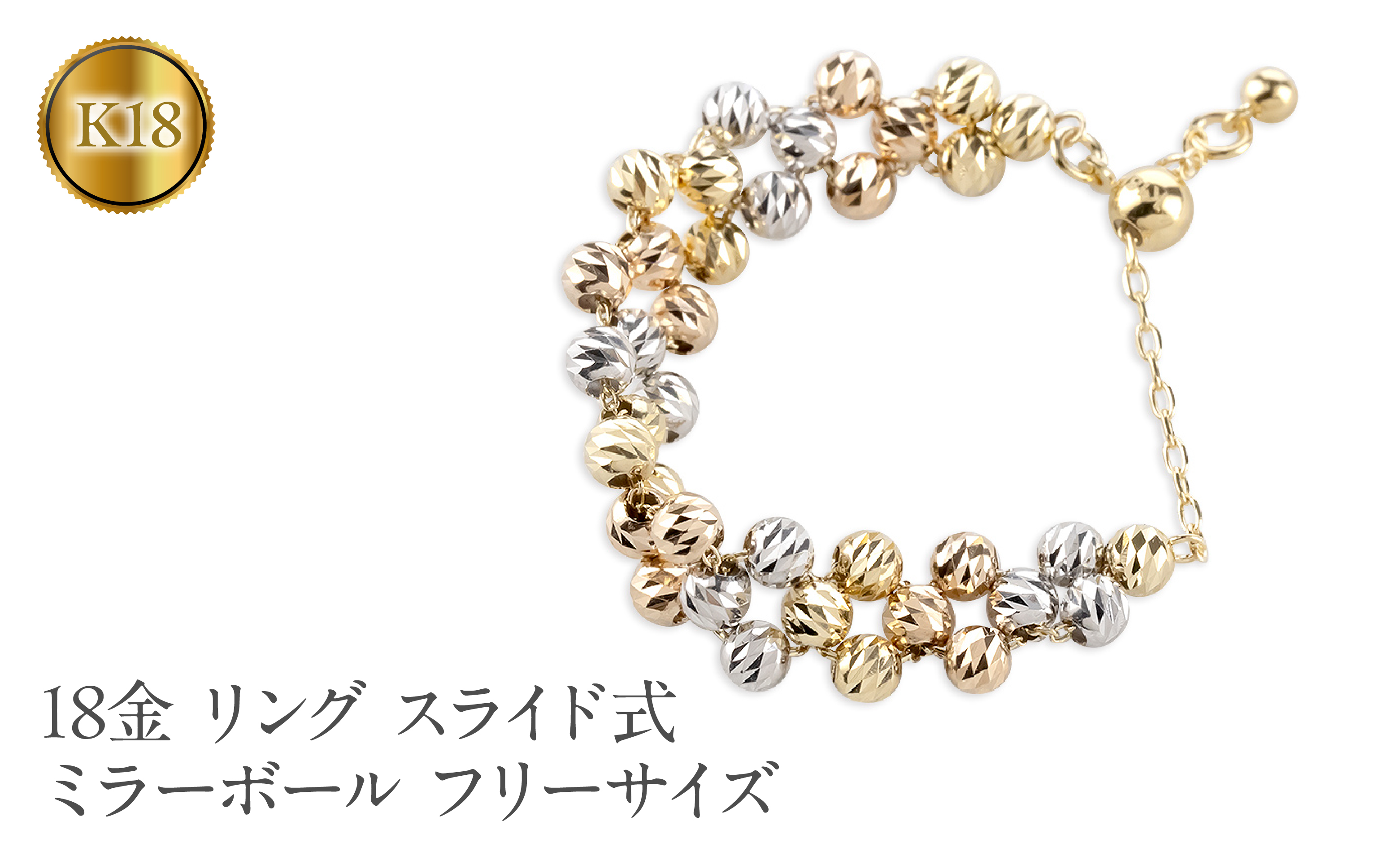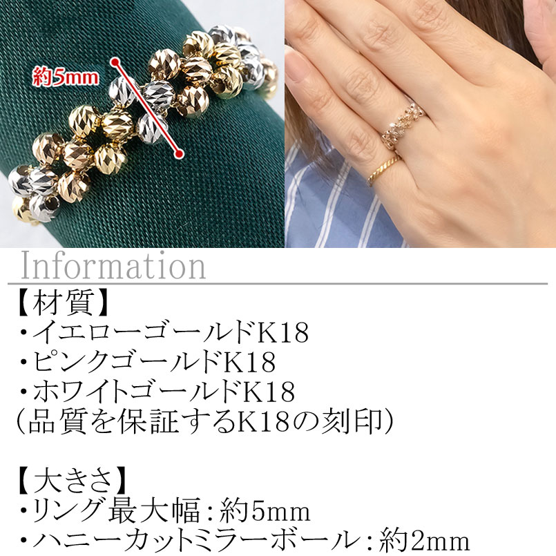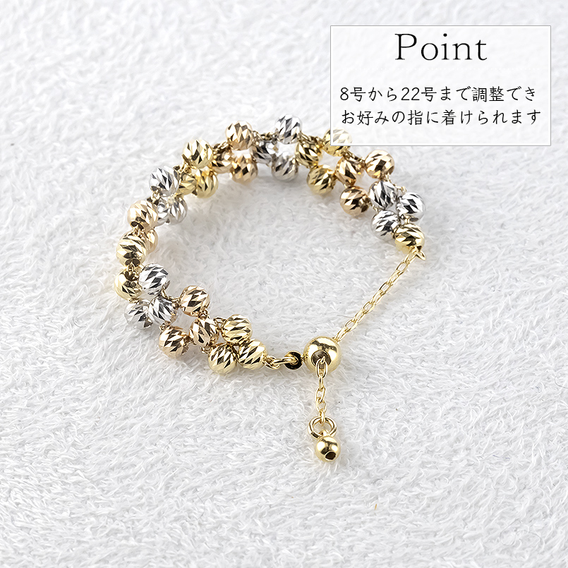 3色の2.5ミリハニーカットミラーボールを丁寧に編み込んだボリューム感のあるチェーンリング
