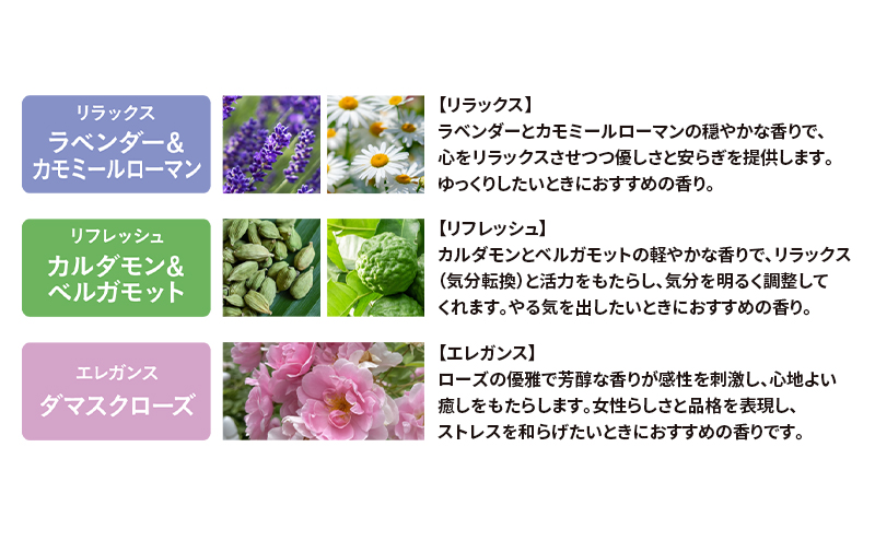 ローズの優雅で芳醇な香りが感性を刺激し、心地よい癒しをもたらします。女性らしさと品格を表現し、ストレスを和らげたいときにおすすめの香りです。