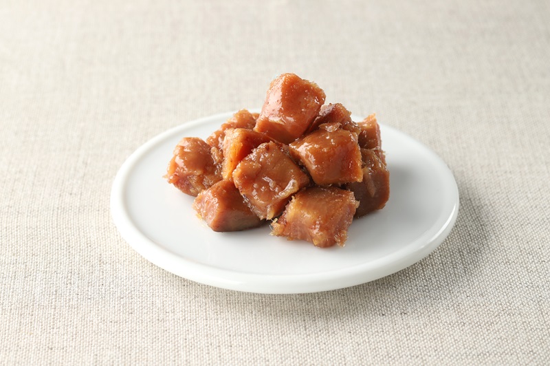 (1)まぐろ角煮とは(通称「角煮」): 冷蔵庫の無い時代に鮮魚を保存するために工夫された、昔なつかしい甘辛い味付けが特徴です。ご飯との相性は抜群です。