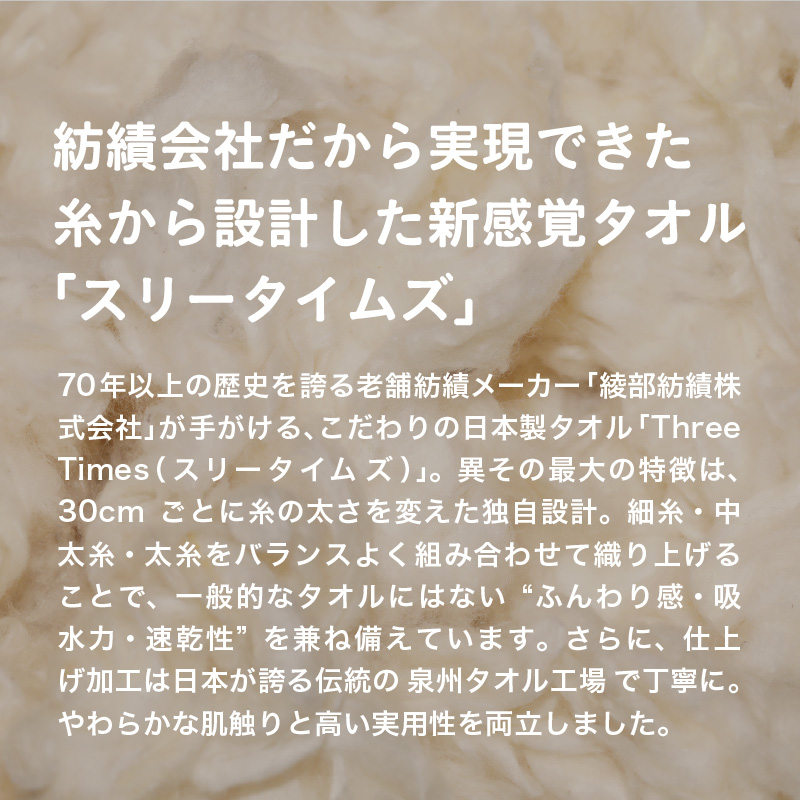 70年以上の歴史を誇る老舗紡績メーカー【綾部紡績株式会社】が手がける、こだわりの日本製タオル「Three Times(スリータイムズ)」。