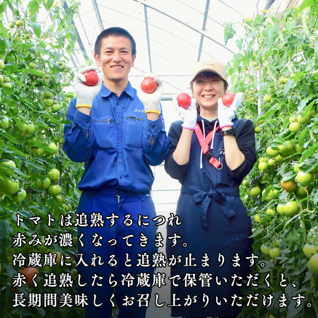 トマトは追熟してお楽しみいただけます。追熟させることで、果肉が柔らかくなり酸味が抜けて甘みが強くなります。追熟させる際には、直射日光の当たらない風通しのよい場所で常温で保管ください。追熟するにつれ赤みが濃くなってきます。冷蔵庫に入れると追熟が止まります。