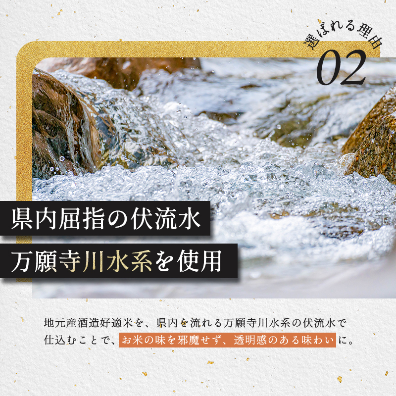 地元産酒造好適米を、万願寺川水系の伏流水で仕込みました。米の旨みと豊かに立ち昇る吟醸香が特徴の純米大吟醸酒です。