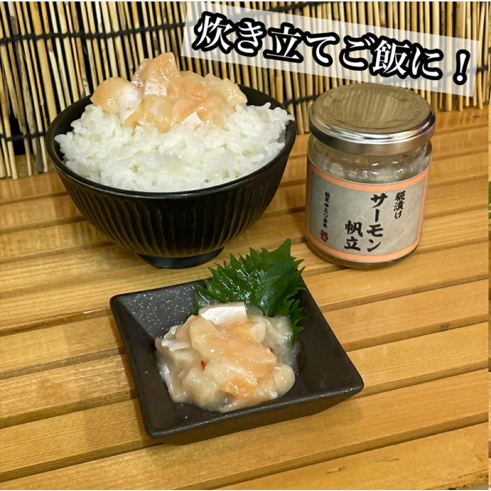 ノルウェー産のサーモンと旨み豊富な国産のホタテ貝柱を塩糀に漬け込みました。