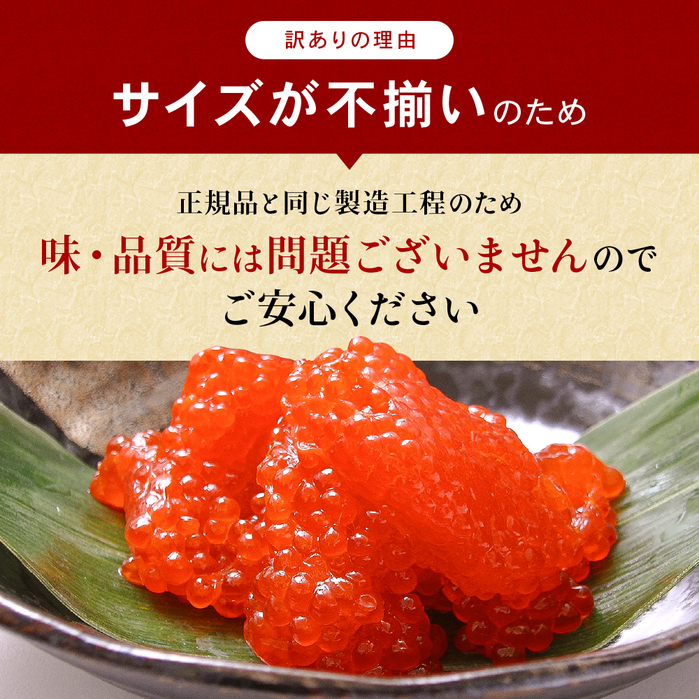 アラスカの紅鮭卵を味わいある塩漬に仕上げました。サイズが不揃いな訳あり返礼品ではありますが、正規品と同じ製造工程で加工しておりますので、もちろん味は一緒です。