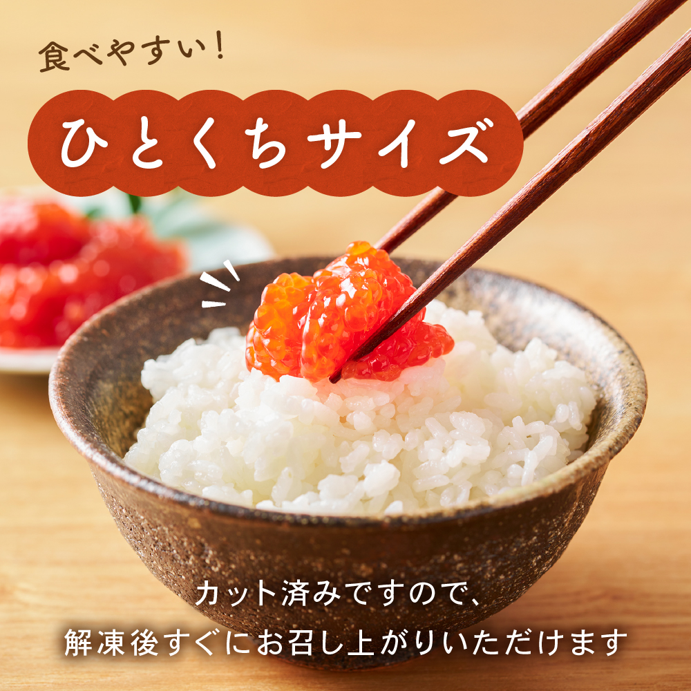 筋子を食べやすいひとくちのサイズにカットしてありますので、解凍後すぐにお召し上がりいただけます。