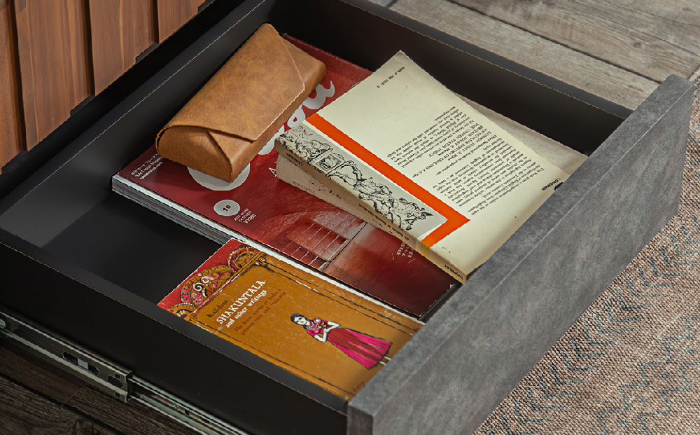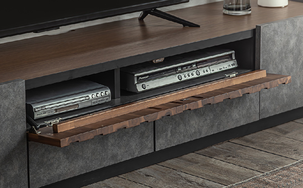 モルタル調の前板とブラウン木目が特徴的な家具シリーズ。