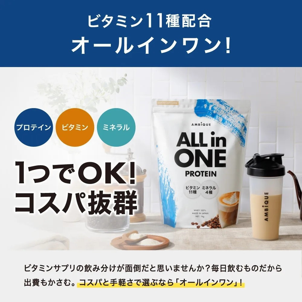 「ビタミン11種配合のオールインワンプロテインなので、ビタミンサプリの飲み分けが不要。