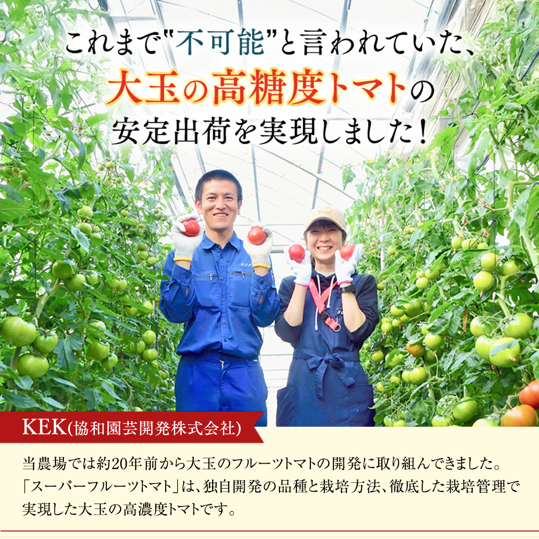 抗酸化作用が強く、免疫力向上効果が期待されるリコピンが通常のトマトの約2倍含まれております。リコピンは美容効果も期待されているため、健康にもお肌にも良いおいしいトマトです。
