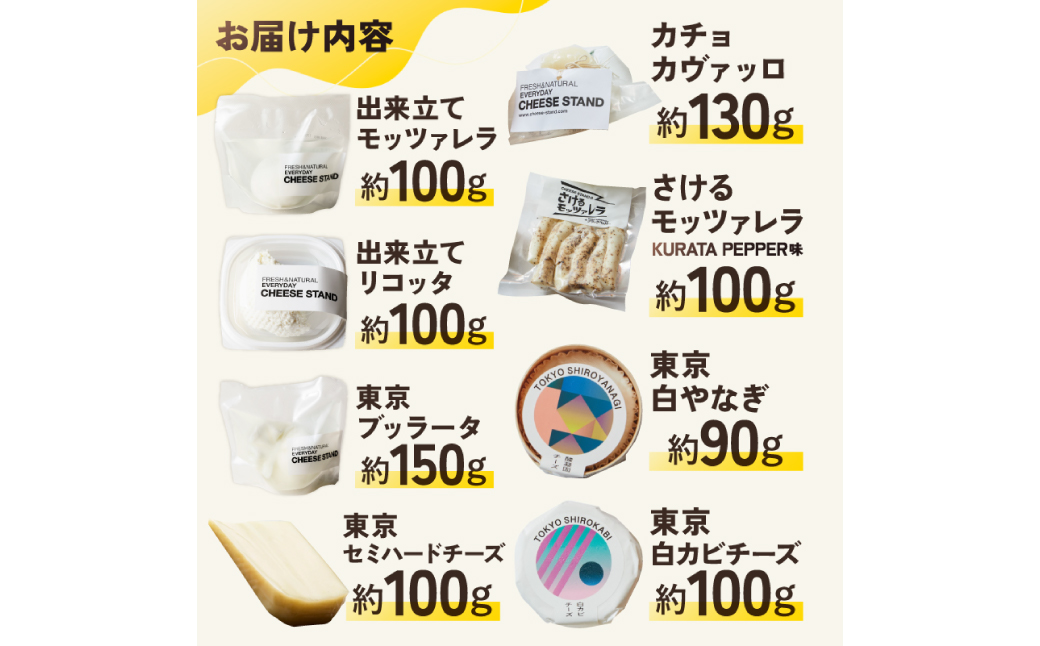 定番フレッシュチーズ3種類と人気のカチョカヴァッロ、さけるモッツァレラ、そこに新製品の熟成3種が加わったCHEESE STANDを満喫できるセットです。