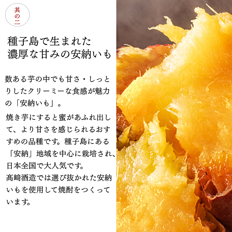 安納いものふくよかな甘い香りと、やわらかい甘味を楽しめる味わい深い焼酎です。