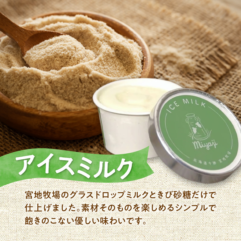 宮地牧場のアイスセットは3種アイスをお送りします。グラスドロップミルクと農薬や化学肥料不使用のきび砂糖だけで作ったアイスミルク。