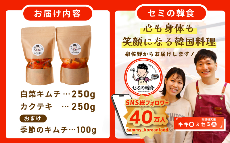 白菜キムチ(250g)、カクテキ(250g)、おまけ季節のキムチ(100g)