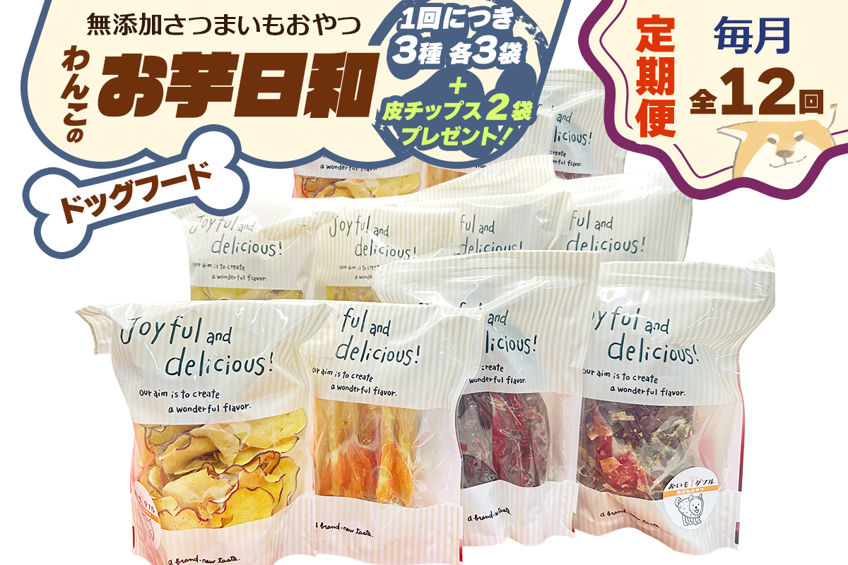 12ヶ月間にわたり毎月、無添加 わんこのお芋日和《無添加さつまいもおやつ》&皮チップス2袋をお届けする定期便です。
