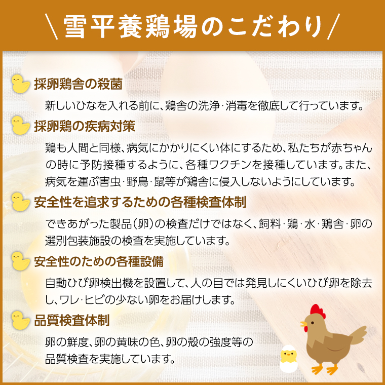 【安全】 (採卵鶏舎の殺菌):新しいひなを入れる前に、鶏舎の洗浄・消毒を徹底して行っています。 (採卵鶏の疾病対策):鶏も人間と同様、病気にかかりにくい体にするため、私たちが赤ちゃんの時に予防接種するように、各種ワクチンを接種しています。また、病気を運ぶ害虫・野鳥・鼠等が鶏舎に侵入しないようにしています。