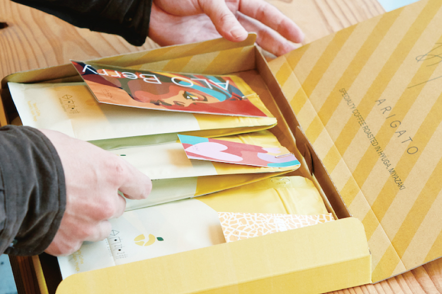 ・コーヒーの種類ごとに生産者の顔や農園情報などがわかるカードを添えて、オリジナルボックスにてお届けします。