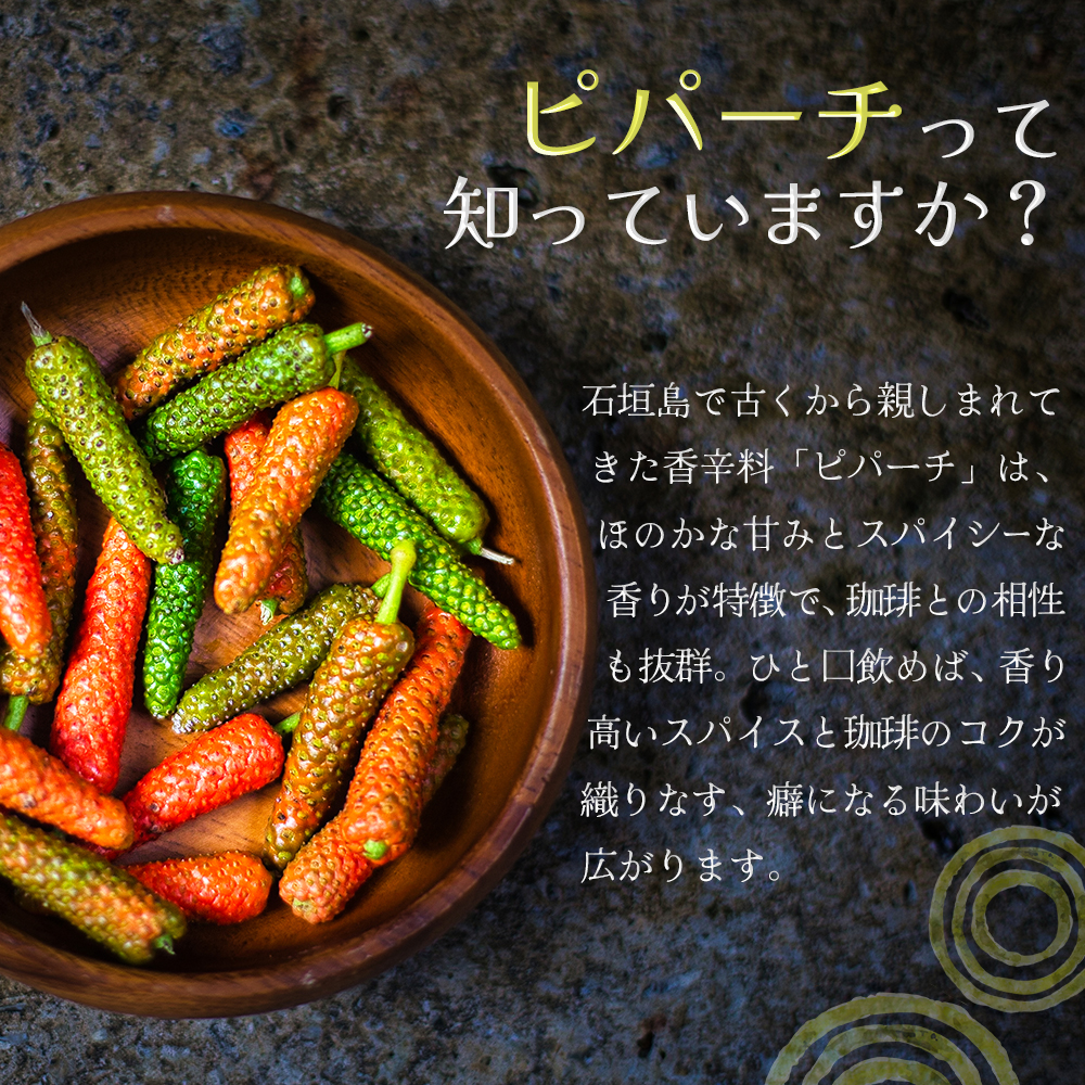 石垣島で焙煎したコーヒー豆にデトックス効果も期待されているピパーチを混ぜ込んだ健康効果を取り込める水出し&ドリップ珈琲。