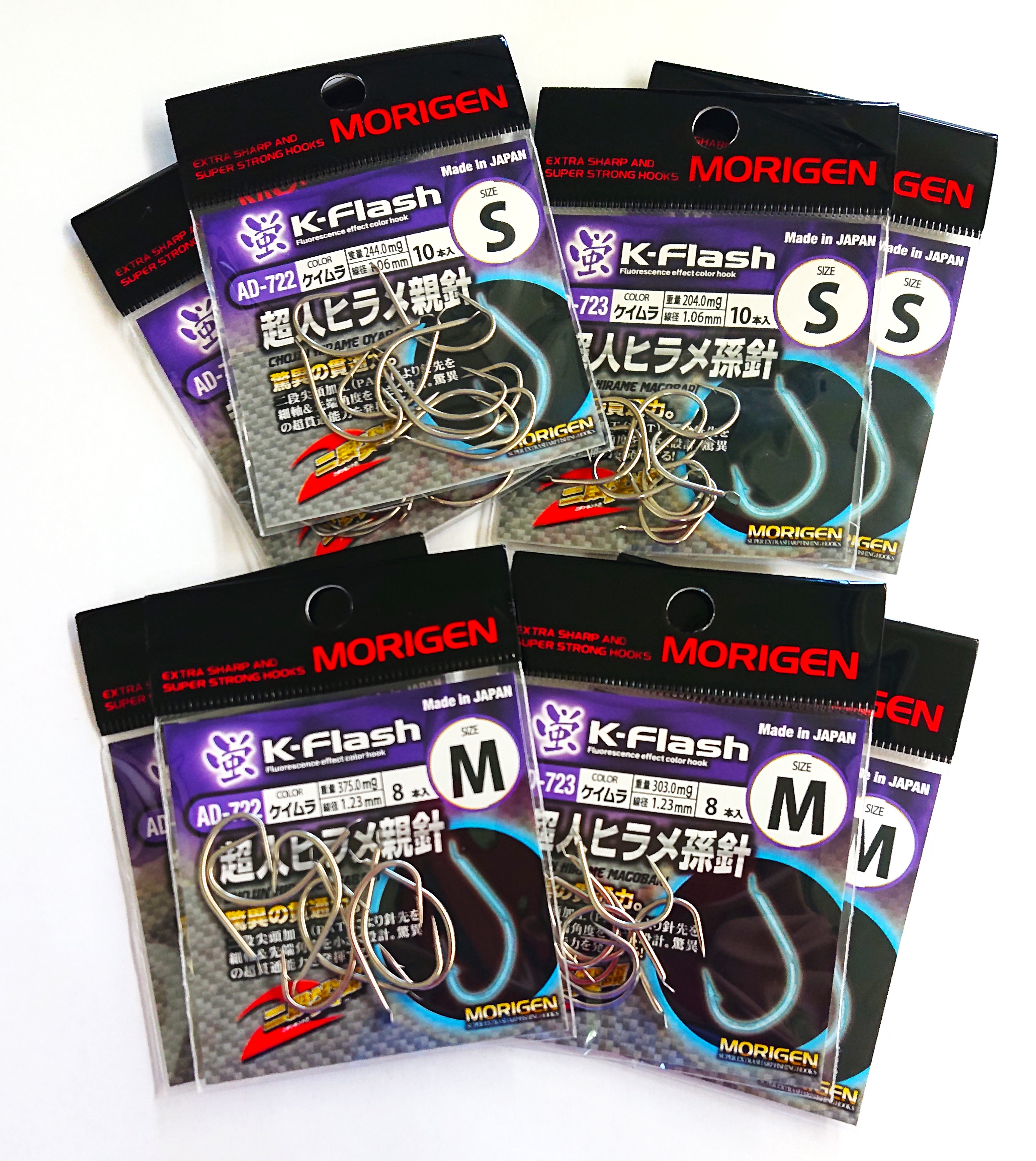 原材料:鋼 サイズ:S・M 色:ケイムラ 内容量:S/10本入・M/8本入 セット内容:親針:S/2枚・M/2枚 孫針:S/2枚・M/2枚