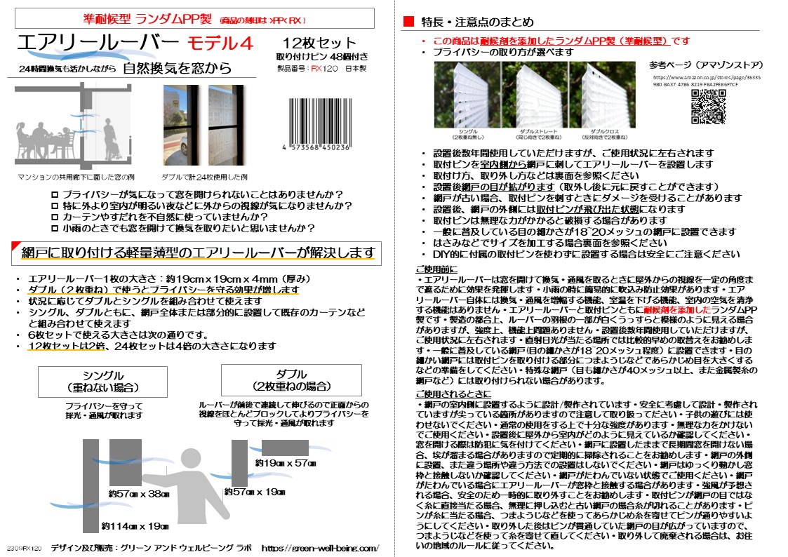 エアリールーバー モデル4(網戸に取付ける薄型軽量ポリプロピレン製準耐候型ルーバー)12枚セット