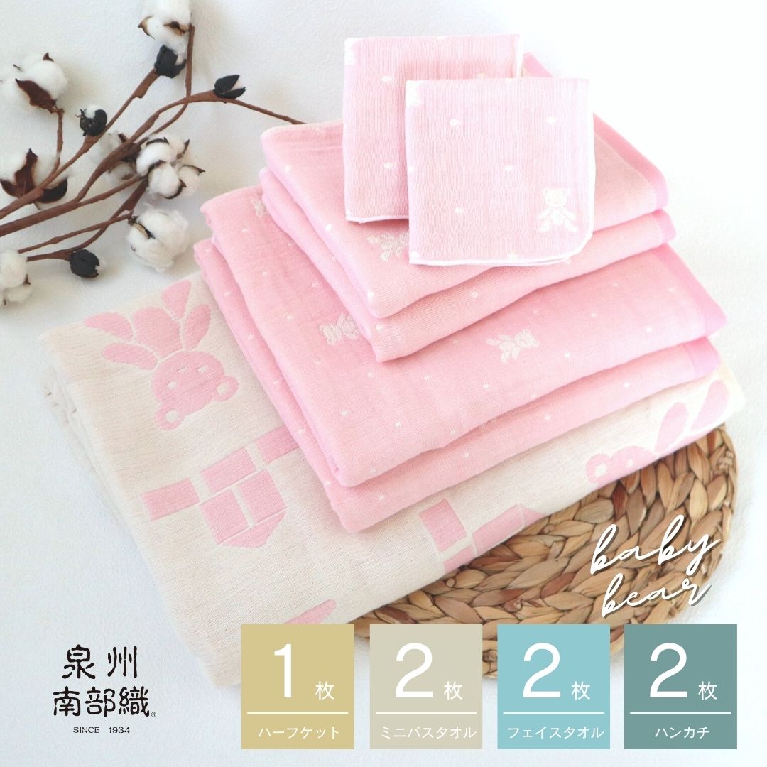 6重ガーゼのハーフケット、4重ガーゼのミニバスタオル・フェイスタオル、3重ガーゼのハンカチの、赤ちゃんからキッズまで使えるアイテムが揃ったボリュームのあるセットです。