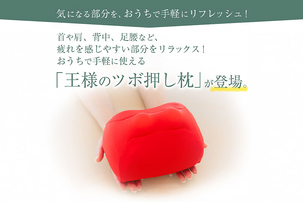 おうちで手軽に体をケアできる枕型の指圧の代用アイテム。日々生活の中でたまりがちな負担のケアをサポートします。体に負担がかかるのは毎日のことだから、こまめにケアしたい。王様のツボ押し枕は、まるで王様のような気分になれる贅沢な心地よさとリフレッシュ感を、毎日手軽に体感できるアイテムです。