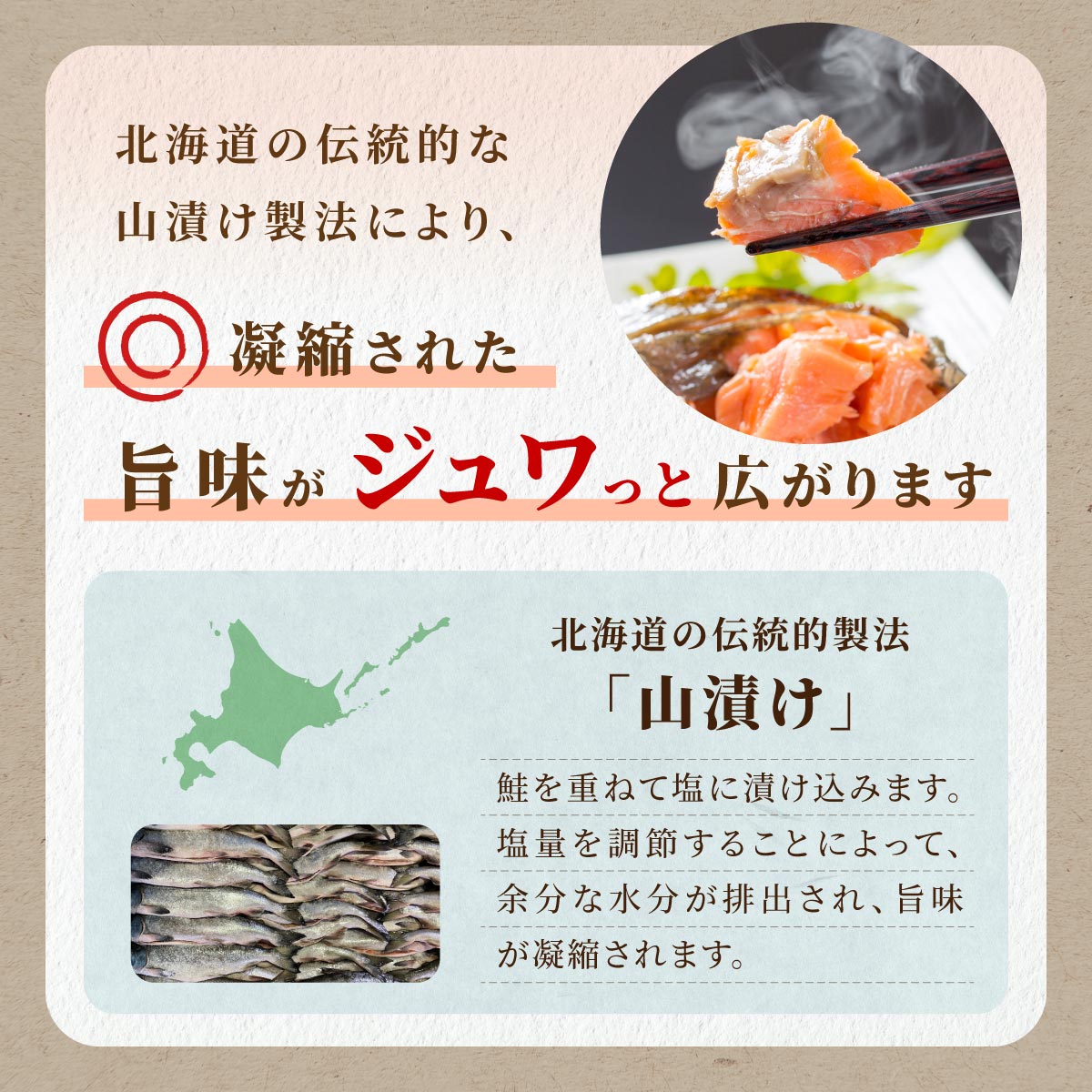 山漬製法で水分を抜き旨味を凝縮。(尾部等は塩分が強い傾向があります。)