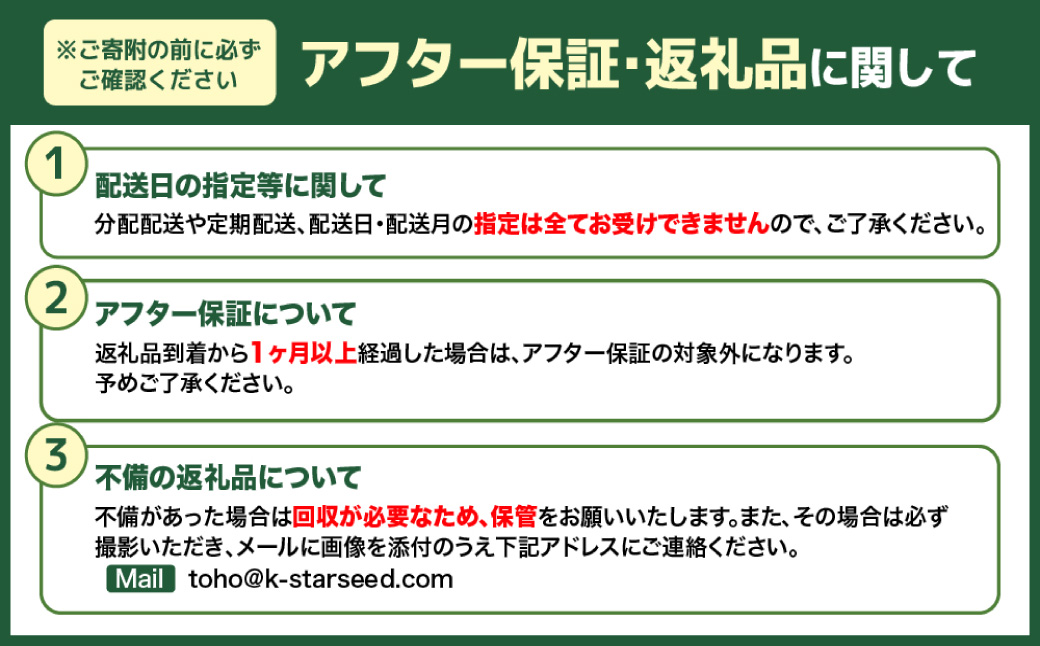 万全を期して返礼品をお届けしていますが、万が一、不備等があった場合は返礼品到着から2日以内に、写真(画像)を添付のうえメールにてご連絡ください。