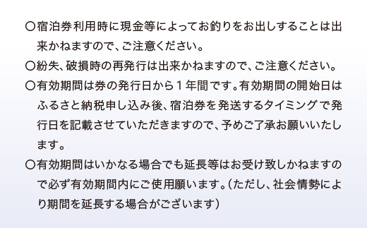 〇有効期間は券の発行日から1年間です。有効期間の開始日はふるさと納税申し込み後、宿泊券を発送するタイミングで発行日を記載させていただきますので、予めご了承お願いいたします。