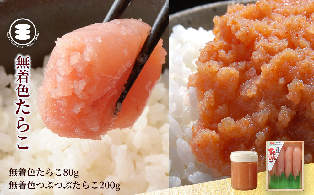 ・無着色たらこ80g ・無着色つぶつぶたらこ200g 【原材料】 すけとうだらの卵(ロシアまたはアメリカ)、食塩/調味料(アミノ酸等)、甘味料(ステビア)、酸化防止剤(V.C)、発色剤(亜硝酸Na)