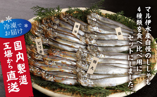 内容量:塩ししゃも(350gx1箱)・特大ししゃも(420gx1箱)・ピリ辛ししゃも(420gx1箱)・醤油ししゃも(420gx1箱)