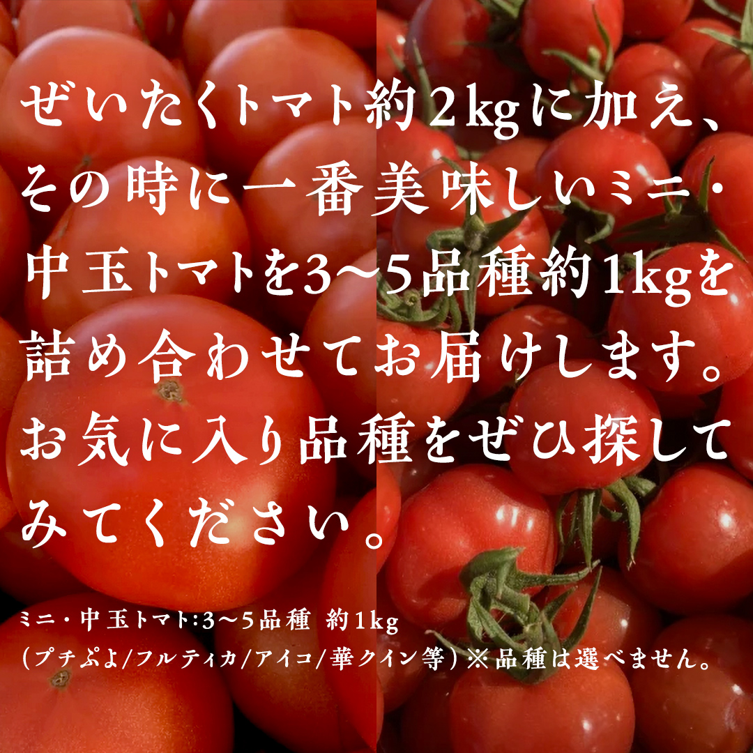 【内容量】・ぜいたくトマト約2kg・ミニや中玉 3~5品種 約1kg(プチぷよ/フルティカ/アイコ/華クイン等)※品種は選べません。その時に収穫された1番美味しいトマトをお送りします。