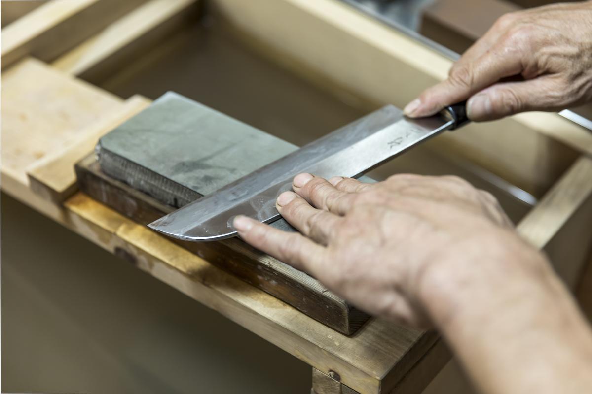 食道具竹上のハガネ包丁は、砥石を使用し職人の手による「本刃付け(ほんばづけ)」を施しております。