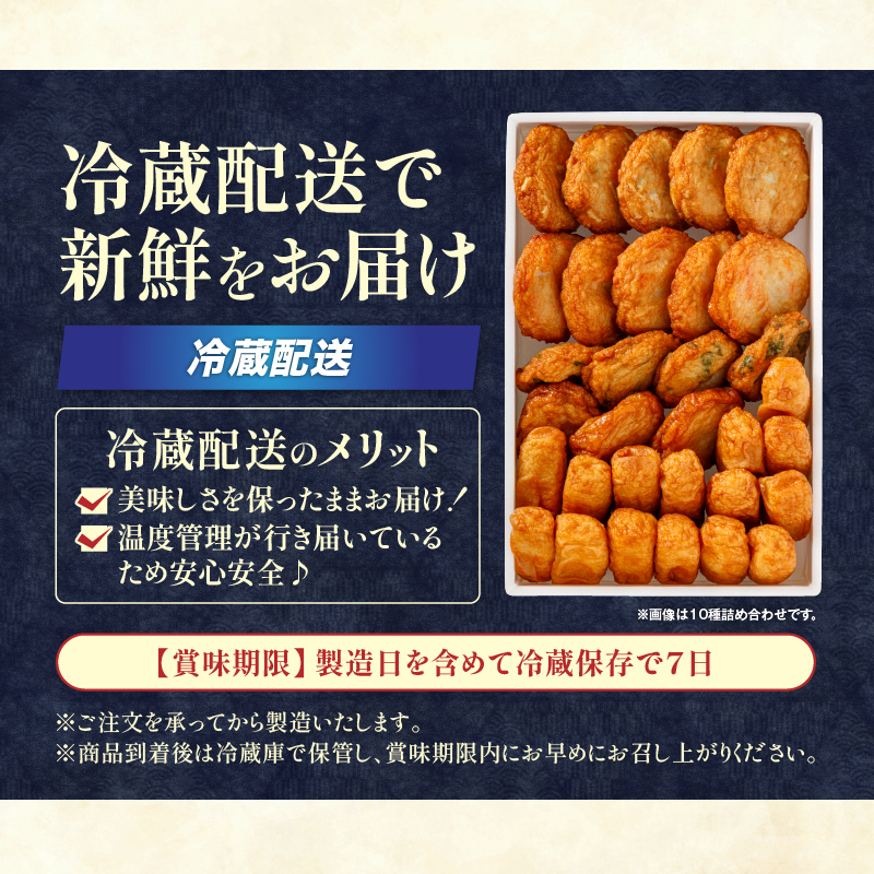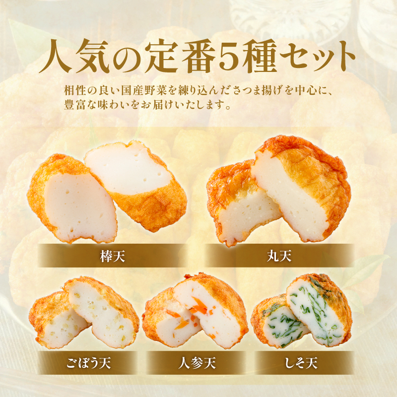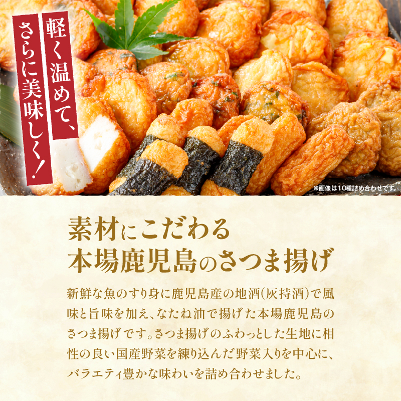 さつま揚げのふわっとした生地に相性の良い国産野菜を練り込んだ野菜入りを中心に、バラエティ豊かな味を詰め合わせました。