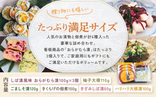 - 【Fセット内容】 ・しば漬風味 おらがむら漬100g×3個 ・柚子大根110g ・ごましそ漬120g ・きくらげの佃煮100g ・きざみしば漬80g ・ハリハリ大根漬100g