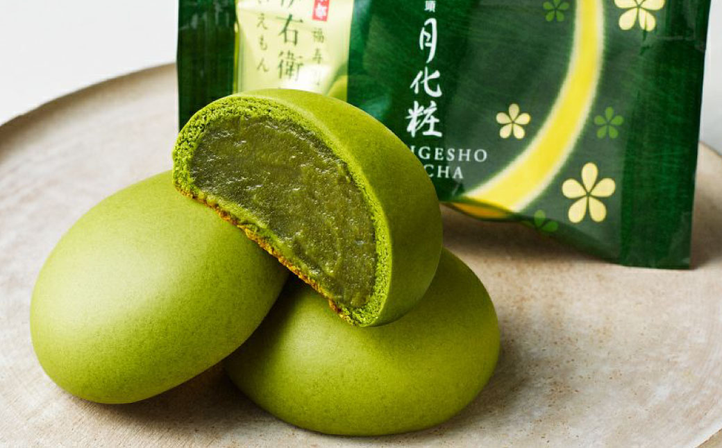 伊右衛門月化粧はみどり鮮やかな石臼挽き宇治抹茶をふんだんに使った、瑞々しい味わいの抹茶みるく饅頭です。