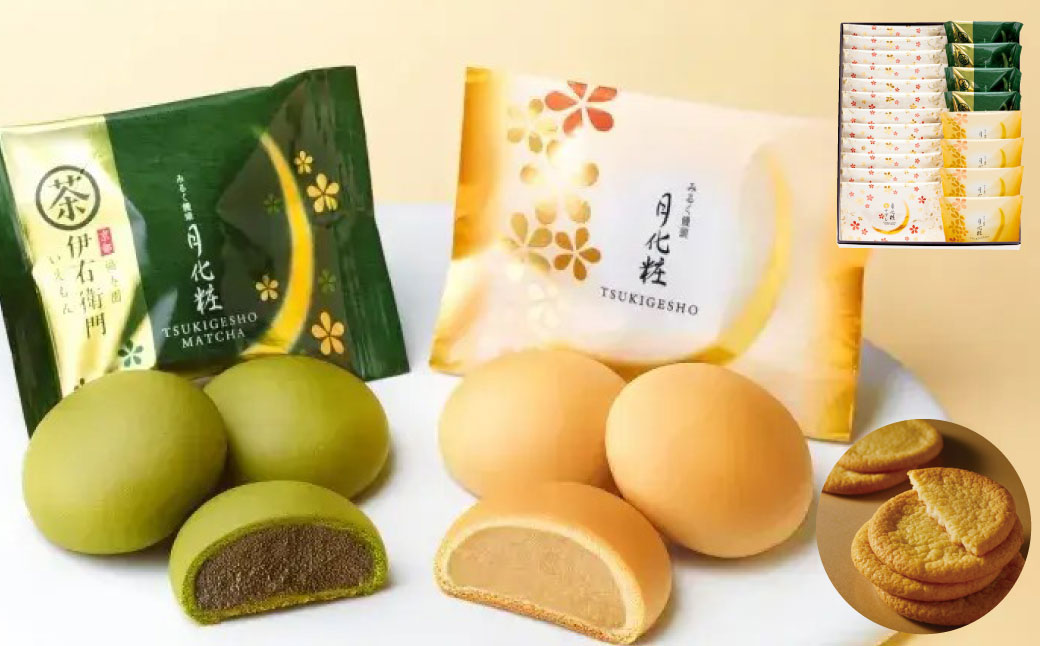 大阪土産としてもおなじみの月化粧は、自家製餡した白餡の中にミルクの風味豊かな練乳とバターをたっぷり入れたみるく餡を包んで焼き上げたやさしい味わいのみるく饅頭。
