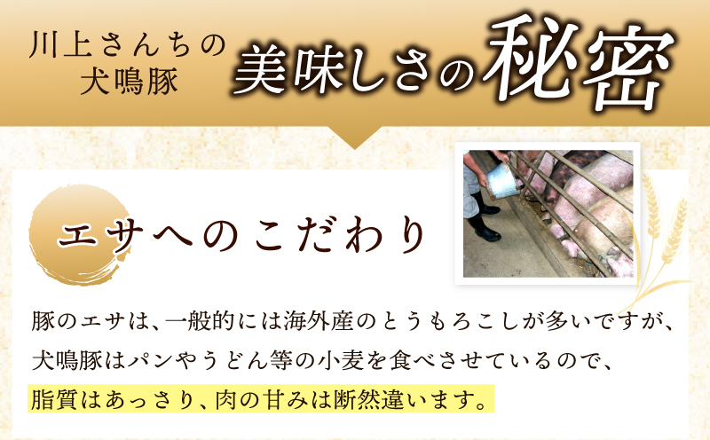 豚のエサは、一般的には海外産のとうもろこしが多いですが、犬鳴豚はパンやうどん等の小麦を食べさせているので、脂質はあっさり、肉の甘みは断然違います。