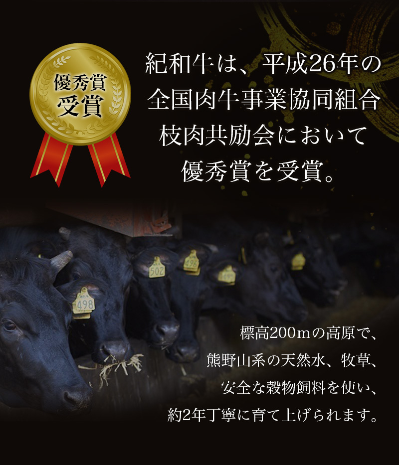 紀和牛は、平成26年の全国肉牛事業協同組合枝肉共励会において優秀賞を受賞。