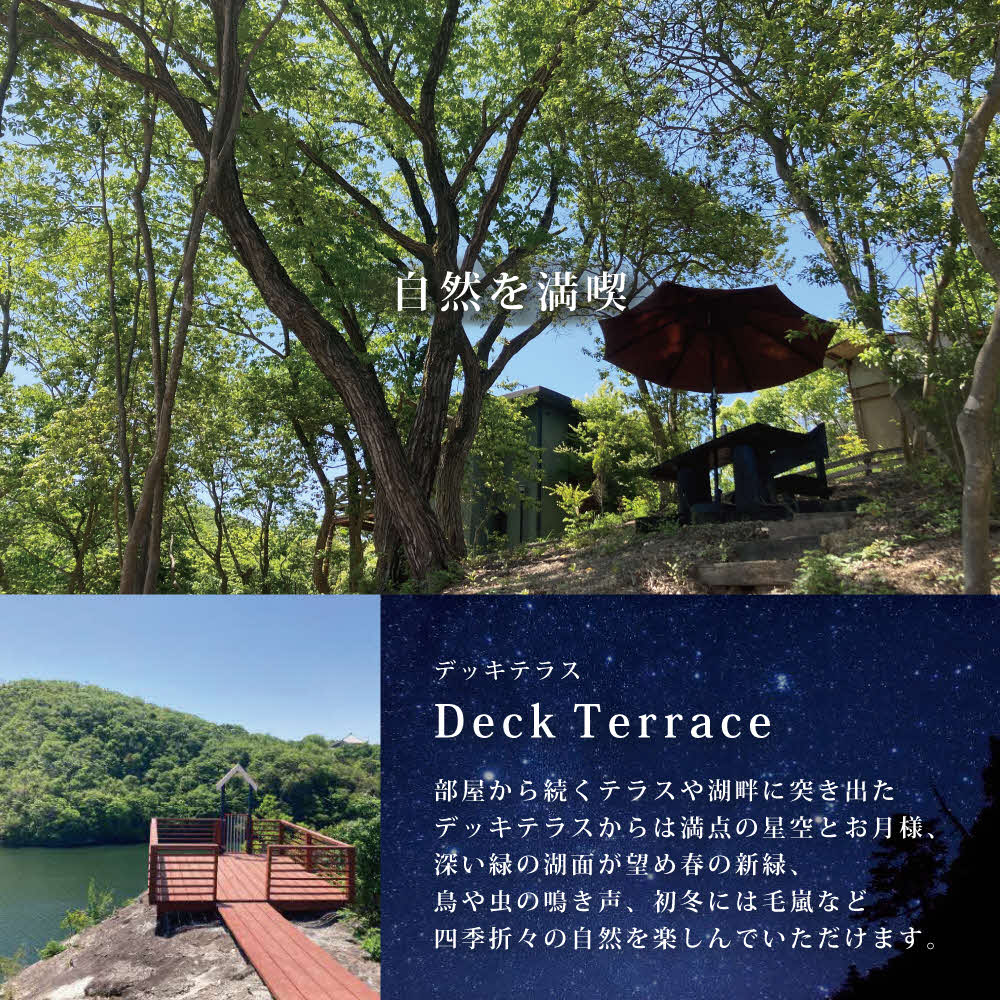 リビングの大きな窓からはまるで額縁におさまったような山の風景が 、部屋から続くテラスや湖畔に突き出たデッキテラスからは満点の星空とお月様、深い緑の湖面が望めます。
