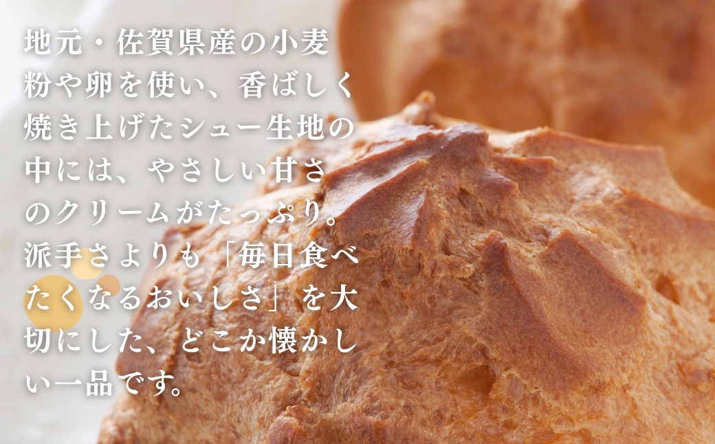 地元・佐賀県産の小麦粉や卵を使い、香ばしく焼き上げたシュー生地の中には、やさしい甘さのクリームがたっぷり。